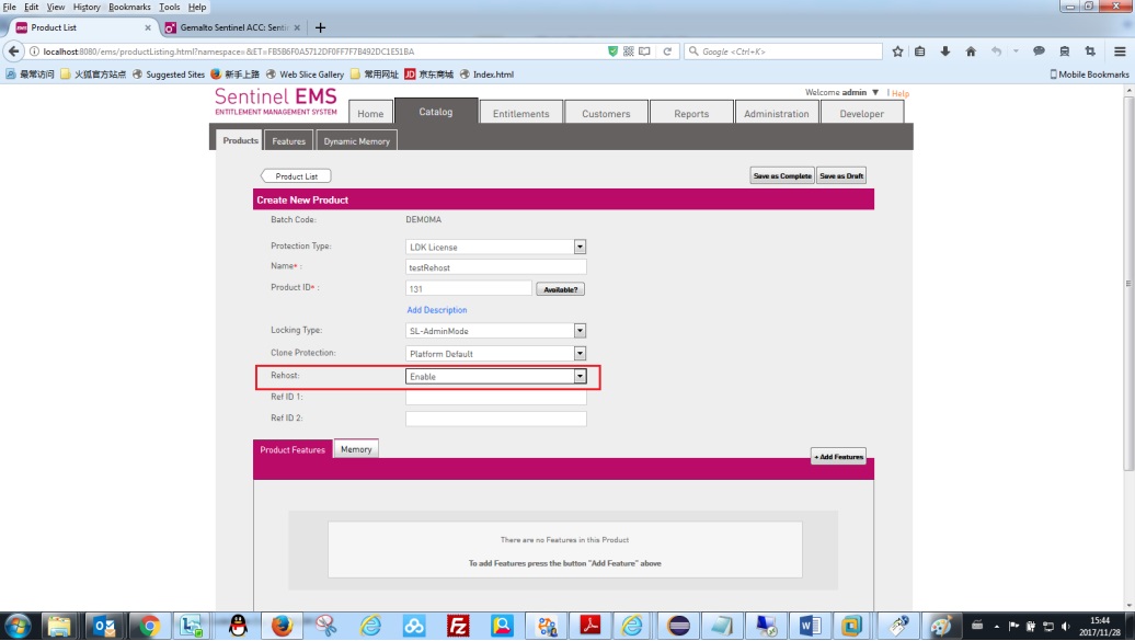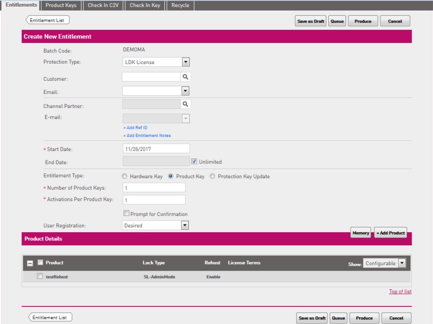 (c、 )去 EMS 里邊Entitlement 標簽頁下,像正常升級加密鎖一樣的標準步驟進行操作。新建 Entitlement,然后Entitlement type選擇中間的Product Key,添加上剛才定義的產(chǎn)品testRehost,然后點擊 Produce,接著 Activate。