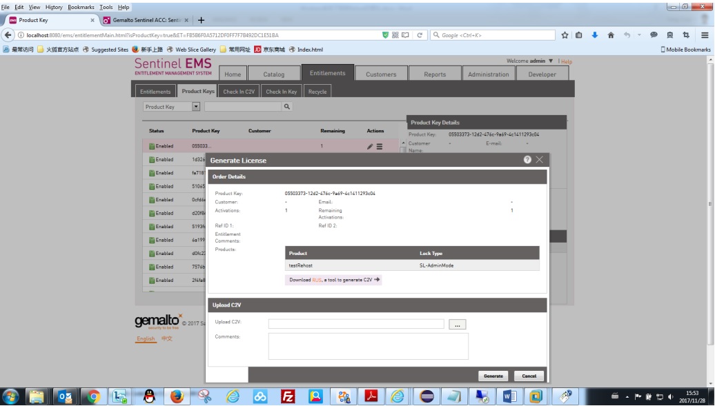 在Generate License窗口中,Upload C2V選擇之前A電腦上需要升級的SL產(chǎn)生的testRehost.c2v文件。然后點擊 Generate產(chǎn)生對應的v2c 升級文件。