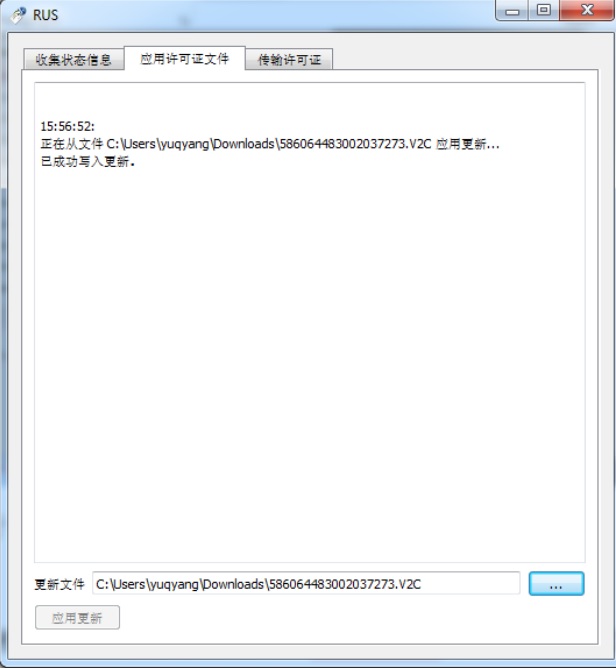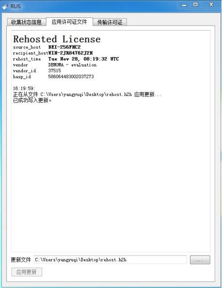 在B電腦上,運行RUS,如下邊截圖,應用許可證文件 rehost.h2h,點擊左下角按鈕“應用更新”即可。