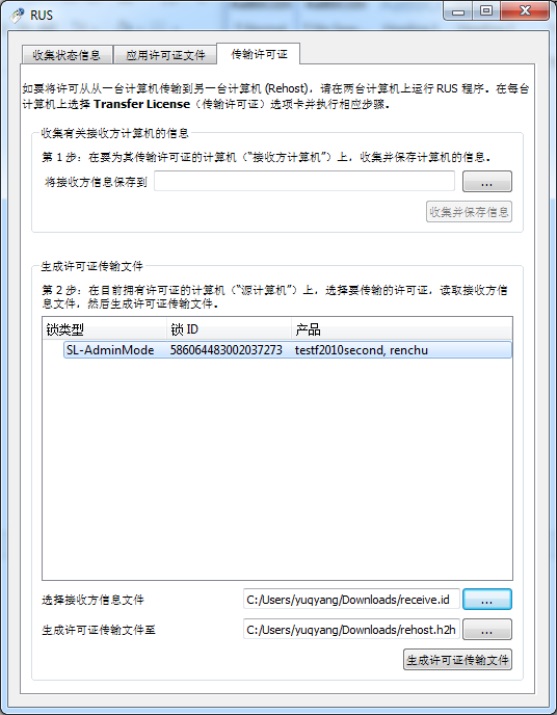 在 A 電腦上,同樣運行RUS,選擇需要Rehost遷移的SL,“選擇接收方信息文件” 選擇 B 電腦上生成的receive.id;“生成許可證傳輸文件至” 選擇一個自定義的名字,比如為 rehost.h2h。點擊右下角的按鈕“生成許可證傳輸文件”即可生成rehost.h2h。將這個 rehost.h2h文件發(fā)給B電腦。