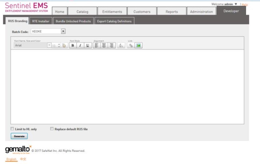 去開發(fā)電腦上打開 EMS,進入 Developer 標簽頁,可以看到RUS Branding標簽頁, BatchCode選擇你的正式號(比如截圖中的 KEOKE),插上主鎖,點擊左下角的 Generate,就可以產(chǎn)生正式號對應的 RUS 遠程升級工具。