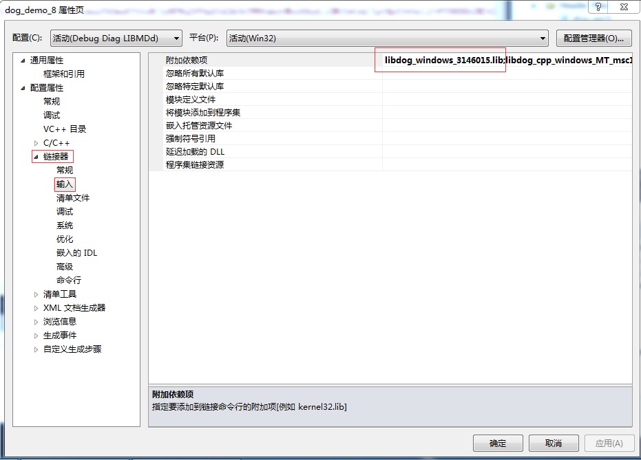 用記事本打開正式號密鑰文件xxxxx.hvc,把內容全部復制,找到示例目錄中的vendor_code.h文件,把hvc文件中的內容替換到“unsigned char vendorCode[] =”后面的引號中,然后點擊“項目”-“屬性”,在"Link"的輸入項中添加依賴庫libdog_windows_x64_xxxxx.lib,并把原來的依賴庫libdog_windows_x64_demo.lib刪除,然后重新編譯生成即可。注意這個libdog_windows_x64_xxxxx.lib庫應拷貝至工程文件所設置的依賴庫目錄列表中。