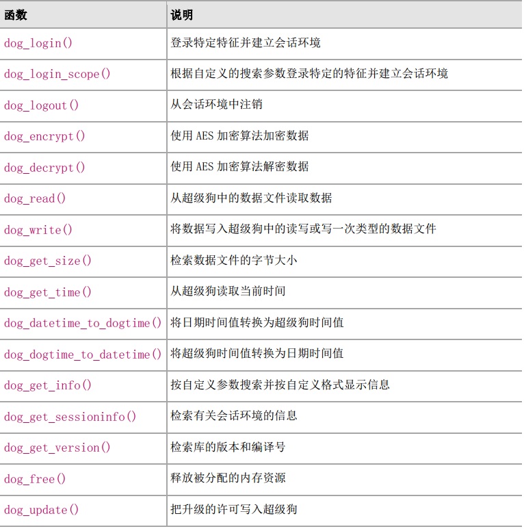 這些函數詳細使用說明,請通過打“超級狗工具包“,在操作手冊和教程的SuperDog Developer'sGuide.pdf文件來查閱。