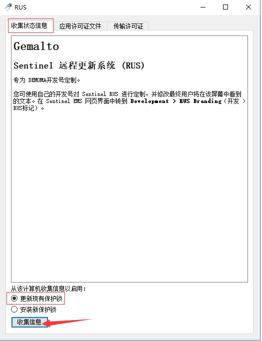 選擇“更新現有的保護鎖”,點擊收集信息,會生成一個擴展名為.c2v的文件,將此文件保存后發給軟件開發商。