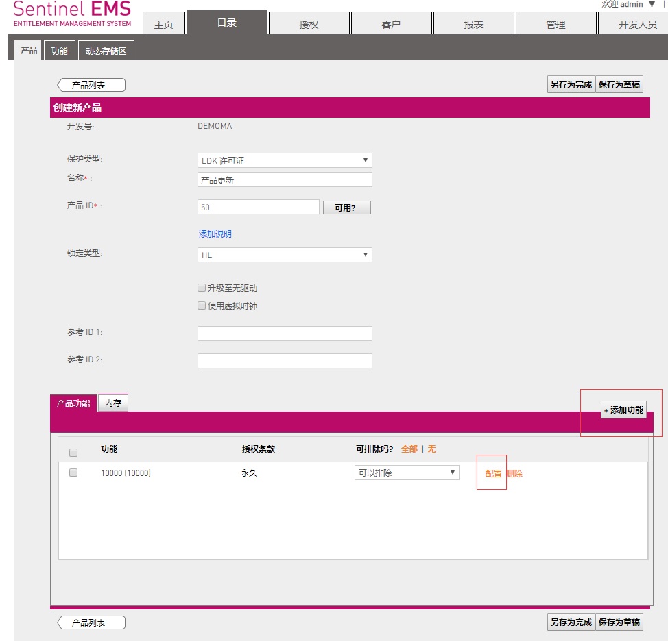 (2).在新建產品頁面,添加新的Feature ID或在“配置”中修改原來加密鎖中的Feature ID屬性(如修改到期時間等)