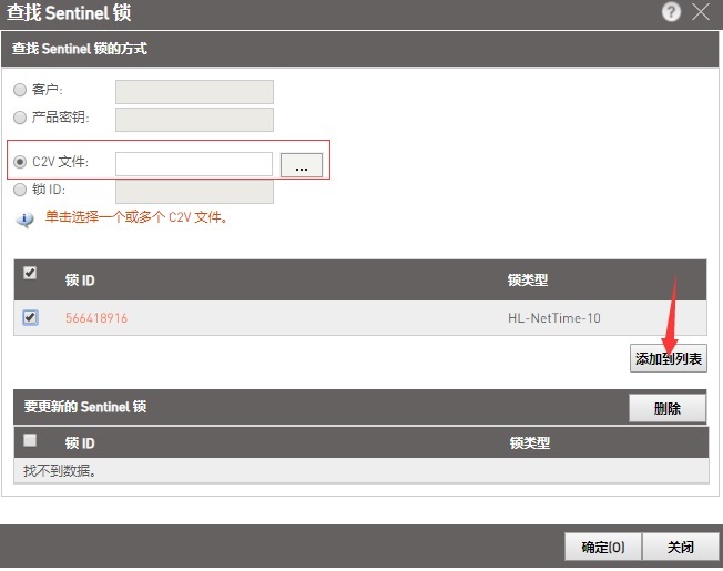 (4). 用c2v文件方式選擇客戶傳回來的.c2v文件,點擊“添加到列表”,最后點確定返回到主界面。(小技巧:如果待更新的加密鎖是此電腦之前燒制過的,也可以直接選“鎖ID”并輸入加密鎖的ID號,就可以省掉前面從用戶處收集.c2v文件這步操作。)