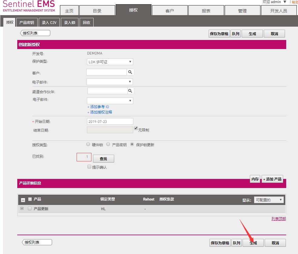 3、軟件開發商在收到此c2v文件后,將此文件錄入到EMS中,然后將需要更新或添加的內容按正常子鎖授權流程新建產品和新建訂單。