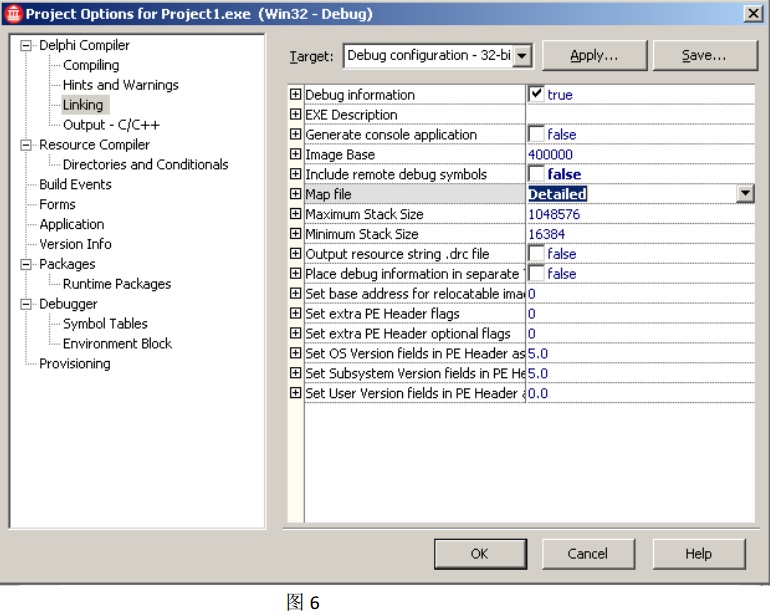 使用 Embarcadero® RAD Studio(XE, XE2 或 XE3)其中任意一個編輯器打開一個已有的 Delphi 工程,在菜單欄中選擇: Project——Options,這將打開工程的 Project Options 對話框, 選擇 Delphi Compiler——Linking,在選項 Map file 處選擇:“Detailed”(如圖 6) ,點擊確定按鈕,然后重新編譯整個工程, map 文件將與 exe 文件生成到同一目錄中。