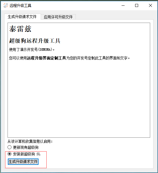 選擇【安裝新超級(jí)狗SL】,并點(diǎn)擊【生成升級(jí)請(qǐng)示文件】,將會(huì)生成一個(gè)擴(kuò)展名為“c2v”的文件,將此文件發(fā)送給軟件開發(fā)商。