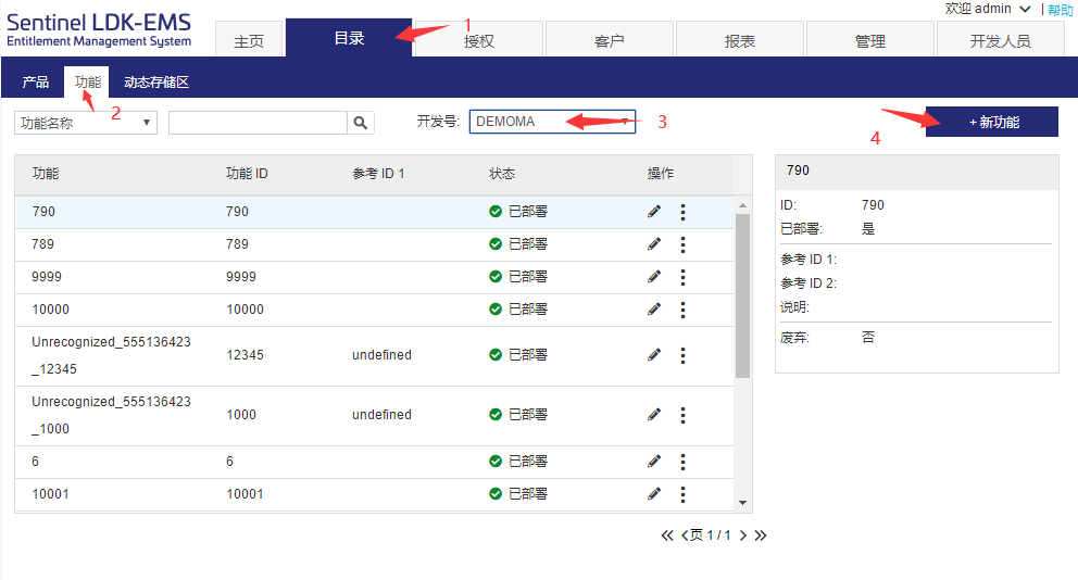 請按圖示步驟選擇1目錄,2功能,3開發號,4新建功能,其中開發號是對應5個字母的主鎖開發號,測試用戶請選擇DEMOMA