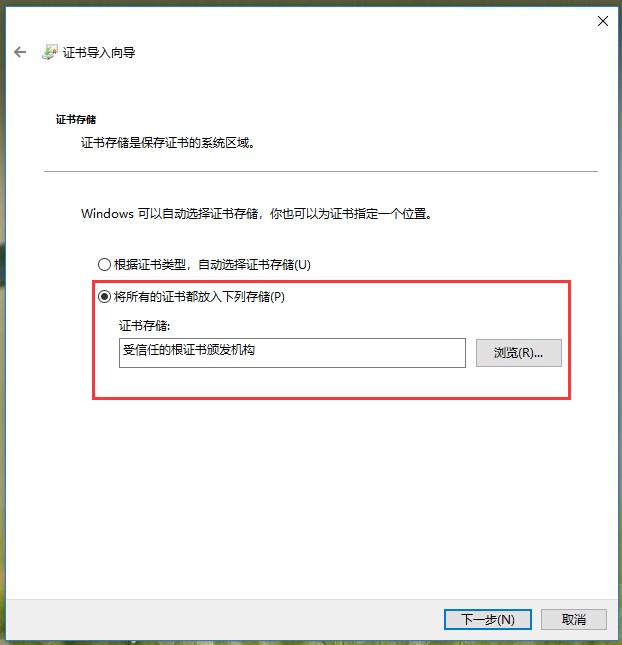 3、選擇“將所有證書放入以下存儲(chǔ)中(Place all Certificates in the following store)” > 點(diǎn)擊“瀏覽” > 選擇“受信任的根證書頒發(fā)機(jī)構(gòu)(Trusted Root Certification Authorities)” > 點(diǎn)擊“確定” > 然后點(diǎn)擊“下一步”;